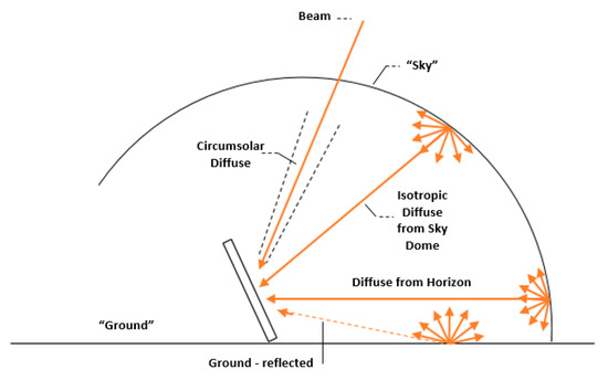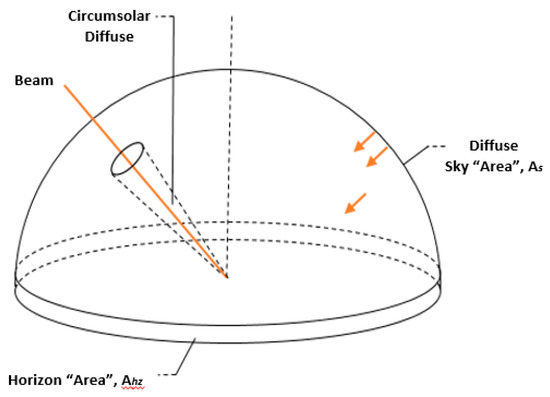 Isotropic radiation is this part of diffuse radiation, that is received uniformly from the entire sky dome. Circumsolar radiation, which is resulting from forward scattering of solar radiation and is being concentrated in the part of the sky around the sun. Horizon brightening radiation is concentrated near the horizon, being the most pronounced in clear skies. Those different radiation parts are expressed in Figure 9 [28].