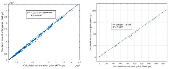 The calculated coefficient of variation in root mean squared error was 6.35% for the training building data and 4.08% for the validation building data, which is lower than allowed 20%, which allows to qualify the quality of the found reduced order model satisfying [29]. To validate the linearity of the correlation between calculated and simulated annual solar heat gains, the previously found statistical correlation with the R2 of 0.997 and 0.999, respectively, as calculated by Equation (24) is represented in Figure 12.