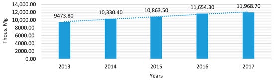 MSWIBA in the construction industry is part of sustainable development and the circular economy. Concrete is exceptionally good for the environment, as it immobilizes contaminants and pollutants. Growing production and consumerism causes an increase in the amount of produced solid municipal waste, which then increases the amount of MSWIBA in Poland. In order to operate in line with the concept of a circular economy, it is a necessity to pre-recycle secondary waste. Figure 2 depicts the amount of municipal solid waste in Poland.