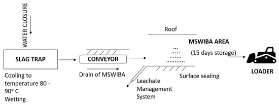 The slag trap is equipped with a water lock. The water is kept constant. This prevents false air from entering the chamber, as well as exhaust fumes and dust from the chamber leaking outside the system. MSWIBA is cooled to a temperature of 80 °C–90 °C. Appropriate hydration prevents secondary dusting. MSWIBA is transported using a conveyor belt to the MSWIBA area, which has to be roofed, paved, sealed, and equipped with a leachate management system. MSWIBA should be stored for 15 days. Then, the loader transports it to the installation responsible for sorting and mechanical treatment of MSWIBA (Figure 4).