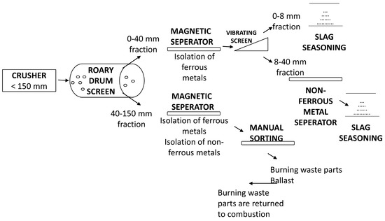 MSWIBA is crushed on a <150 mm fraction; then, a rotary drum screen separates the 0–40 mm and 0–150 mm fraction. These fractions then reach the magnetic separators, where ferrous metals are isolated. The 0–40 mm fraction is directed to the vibrating screen, in which a separation into 0–8 mm and 8–40 mm fractions occur. Smaller fraction—without ferrous metals—is heaped into a pile. The 8–40 mm fraction is directed towards a non-ferrous metal separator, and then it is also heaped into a pile. After isolating ferrous and non-ferrous metals from the 40–150 mm fraction, the MSWIBA is transported to manual sorting. Combustible waste is returned to the chamber.