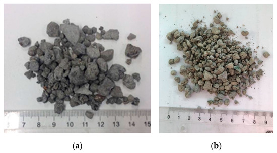 Secondary waste from an incineration plant: (a) municipal solid waste incineration bottom ash after valorization (MSWIBABV); (b) municipal solid waste incineration bottom ash after valorization (MSWIBAAV).