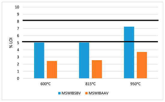 In Figure 6, the 5% limit value for waste in Category A was marked. In terms of LOI, MSWIBABV cannot be used in Category A concrete, because the LOI at 950 °C is 7.26%, but MSWIBAAV can be used in Category A (Table 7). Both slags can be landfilled, because the value does not exceed 8% at 600 °C.