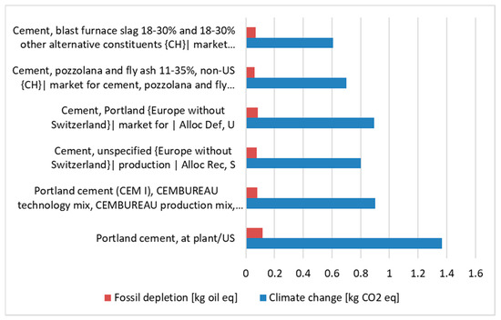 When analyzing a particular result, it can be observed that, in the fossil depletion category, the cement from raw material production has the biggest impact on the environment in each case—CEM I, Portland cement, and unspecified—average in EU (Europe). This is related to the depletion of the raw material in relation to the total reserves that are available and using fossil fuels in order to extract the product. By using secondary waste, which has the smallest impact on the environment, this valuable raw material can be saved, while additionally utilizing waste that is difficult to manage (cement with slag and ash). The only downside is that this waste must be prepared and processed before use (like in any process, chemicals and energy are used). However, when considering the overall environmental impact, especially the emissions to water and soil avoided during possible landfill, the process has a lower environmental impact in the fossil depletion category than the use of raw material in cement production. The same result can be observed in the case of the climate change category. The biggest impact can be seen in case of cement production from raw sources. The results for cement production using fly ash or slag are lower than basic ones. It is also linked to the process of production and utilization of fly ash as a secondary waste.