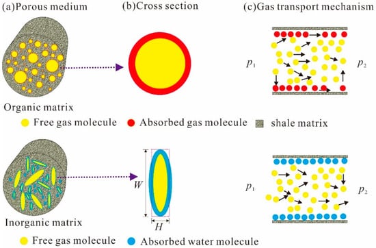 Shale matrix can be classified as organic matrix (ORM) and inorganic matrix (IOM) based on component, and the pore sizes in shale matrix are about 1–1000 nm [4,7]. Gas storage and transport characteristics in two categories of matrix are distinct, due to the different component, surface wettability and pore structures [8]. Core scanning images shows that the majority of pores in ORM are circular, and pores in IOM mainly exhibit slit shape [9]. Gas mainly occurs in ORM as free and adsorbed states owing to hydrophobicity and huge specific surface area. Bulk gas flow and surface diffusion coexist in ORM. IOM is strongly hydrophilic due to its high component of clay and quartz, and irreducible water mainly occurs in IOM [10]. Free gas occupies the center of inorganic pore, and irreducible water is absorbed in the pore wall as water film. Bulk gas flow is dominated transport pattern in IOM. As irreducible water saturation ranges from 0.15 to 0.6 in shale reservoir, influence of irreducible water on gas transport behavior in nanopores cannot be neglected. Furthermore, real gas effect, gas ab-/de-sorption effect and porous deformation also influence gas transport behavior in shale matrix [11]. Thus, accurate evaluation of transport capacity for shale matrix must consider coupling impact of multiple mechanisms [12].