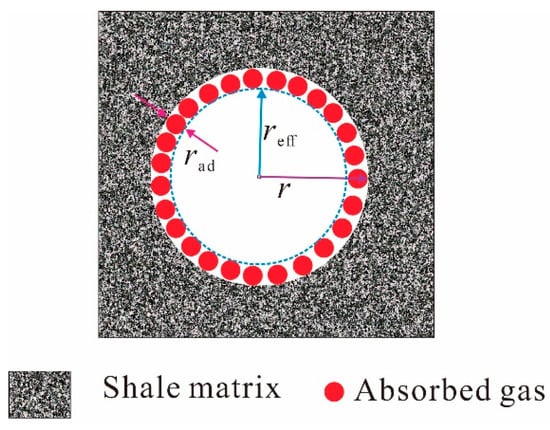 The presence of absorbed gas will decrease the effective radius of organic pores (Figure 2). Influence of absorbed gas layer on hydraulic radius cannot be ignored, due to gas molecular diameter becoming comparable to organic pore size [37]. Gas coverage is commonly used to qualify thickness of absorbed gas layer for monolayer adsorption, and which is defined as follows [17]: