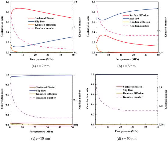 where δ is the surface roughness of pore, dimensionless; kKn-tube is AGP of Knudsen diffusion within organic pore, m2; Df is the fractal dimension of shale sample, dimensionless. The Kn of shale gas under reservoir condition ranges from 0.0002 to 6, so the transport mechanisms of bulk gas flow in shale matrix encompassing slip flow and Knudsen diffusion [16]. Based on molecular collision frequency, the expressions of weighting coefficient of diverse mechanisms in organic pore are given as [26]: