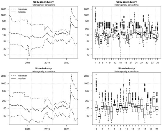 The dependent variable. In the baseline model we define our dependent variable as the individual CDS spreads (as weekly logarithmic changes) with a 5-year tenor for the oil and gas sector firms located in the United States and Canada, as listed in the first row of Table 1. We refer to this group of firms as the baseline sample. In an additional analysis, described in Section 7, we also consider a subsample of single-name CDS spreads for firms from the shale industry (Table 1, second row). We select the firms at least partly involved in shale oil or gas exploration or production. For brevity, we will refer to this group as the shale sample. Summary statistics for the individual CDS spreads calculated over the full time span are reported in Table 2, and Figure 1 depicts the heterogeneity across time and firms for CDS spreads in both samples.