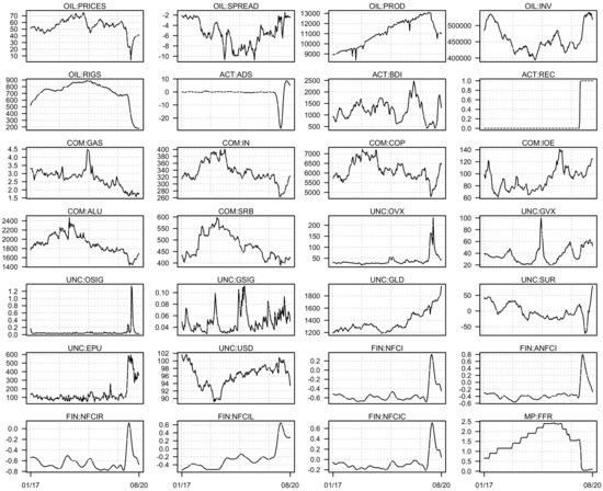 Commodity prices (COM). First, to account for the recent decoupling between the US oil and the US natural gas prices [54,55,56], we include the futures prices of the latter. Second, given the recent debate in the empirical literature on the usefulness of certain commodity prices in approximating business cycles [57], we include in our database five specific variables. We employ the S&P GSCI Industrial Metals Index which approximates the development in prices of most significant industrial metals. Additionally, we include the quotations for four industrial metals of great importance for the industrial production, namely, copper, iron ore, aluminium and steel rebar. The data on commodity prices are drawn from Bloomberg.