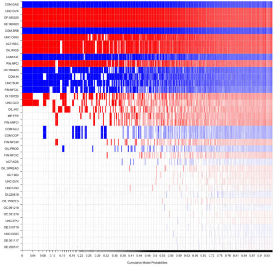 From the empirical perspective, a crucial problem is that specific guidelines regarding the sources of CDS spreads variability in the oil and gas industry are scarce. Seemingly, crude oil prices should be the most reliable determinant of CDS spreads as the profitability of firms in the oil and gas industry crucially depends on the price of its main output. However, given the fact that oil prices are perceived as a barometer for global demand, financial conditions, geopolitical tensions and are frequently used in investment strategies, e.g., [1,2,3], a variety of factors determine their level [4]. As a consequence, the relationship between oil prices and the spreads of CDS issued for bond-related liabilities of oil companies is a high-dimensional phenomenon. Therefore, given the proliferation of potential, common market determinants of CDS spreads, drawing inference from a single model would be unquestionably affected by specification uncertainty and potential misspecification. On the one hand, widely known techniques for dimensionality reduction, such as classical factor analysis, are not particularly suitable for statistical inference when dealing with non-normally distributed observations, as the financial market data [5]. On the other hand, other variable selection methods such as best subsets regression [6] and Bayesian SSVS explicitly ignore the model uncertainty issues (see [7] for a thorough discussion of challenges in the methods suitable for big data). Therefore, a common approach towards controlling for model uncertainty in such instances relies on various model averaging techniques.