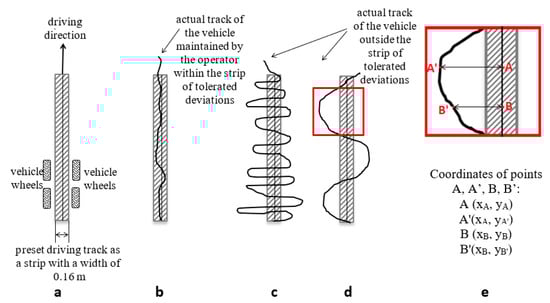 Horizontal plan showing the preset driving track and the actual driving track; (a)—tractor driving direction on a 20 m track, tolerance deviation strip 0.16 m, (b)—correct drive (driving track maintained in the tolerated deviations track), (c,d)—incorrect drives; despite the differences, classified the same, i.e., as an incorrect drive, (e)—spatial parameters of deviations of the actual drive track from the preset track.