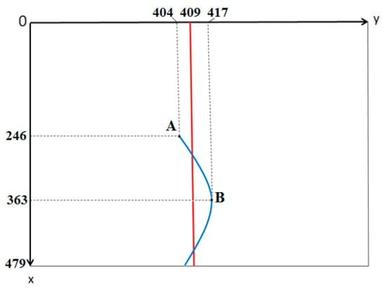 Figure 3. Determined vehicle position at points A and B, in the x and y system, expressed by the number of pixels on the screen (after conversion to numerical data).