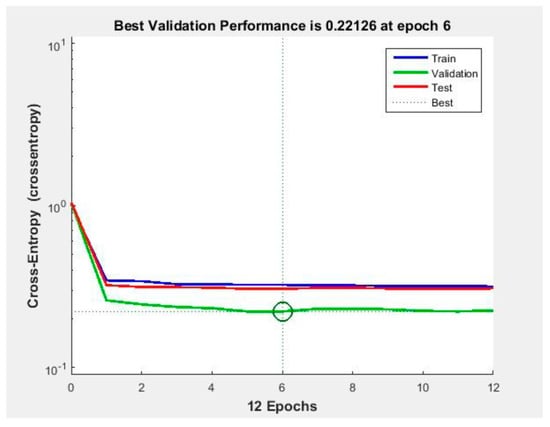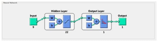For a thorough analysis of the error, the process of teaching the network with selected architectures (i.e., with the highest efficiency—networks using the second-degree coefficients with the architecture 9-22-2 and networks using the third-degree coefficients with the architecture 12-16-2) was checked in the Matlab environment. Due to the random selection of input neurons by the network and another network learning algorithm, the learning results (i.e., the quality of the network) may differ from those presented in Section 4. In addition, the Neural Network Toolbox package only allows the selection of a tool (i.e., a neural network) due to its purpose, apart from the choice of the type of network being tested. Therefore, a pattern recognition network was used by selecting the Pattern Recognition Tool. Figure 6 and Figure 7 show a general structure diagram of both neural networks described using the Neural Network Pattern Recognition Tool from the Neural Network Toolbox package in Matlab environment.