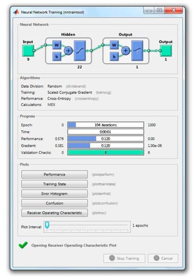 The best results were achieved by the MLP 9–22–2 network. Therefore, it is a MLP network with nine input neurons, 22 hidden layer neurons and two output neurons. This network has achieved learning quality of over 99%, using the BFGS learning algorithm. The first layer of neurons (i.e., the input layer) has a permanently hidden activation function (here: exponential function). The second layer (i.e., the hidden neuron layer) uses the so-called output activation function to process the entered data. The most commonly used functions include: linear, logistic, softmax ones. To solve the problem considered in the paper, the softmax function was selected (automatically, in the Statistica Neural Networks StatSoft package)—the network with the best parameters (i.e., with the highest efficiency) used this activation function.