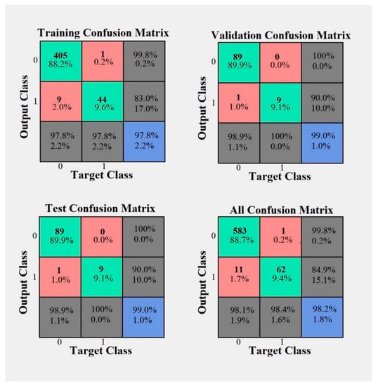 The effectiveness of the artificial neural network in the process of preset classification was assessed using indicators for the effectiveness assessment. Those indicators included: LQ learning quality, VQ validation quality, TQ testing quality, LE learning error, VE validation error, TE testing error and average error. Those indicators were read from the error matrix generated in Matlab (Figure 9 and Figure 10). Errors from all three sets: learning, validation and test mean the value of incorrectly classifying of objects from one class to another.