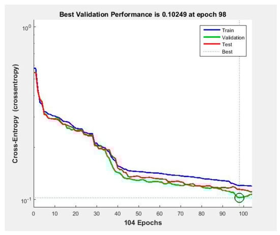The moment when the error calculated for the validation set begins to increase (instead of decreasing with the decrease of the error for the learning set) signals the effect of overfitting the network []. The graphs show that for a network using second degree coefficients this moment occurred in the 98th epoch of the learning process (Figure 11), and for a network using the third degree coefficients—in the sixth epoch of the learning process (Figure 12).