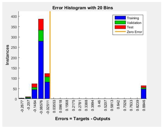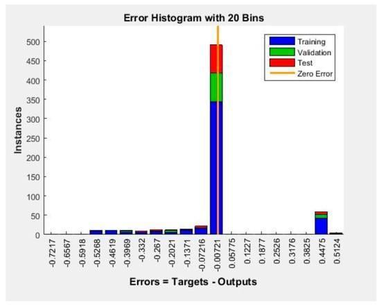 The assessment of the operation of the network using the second degree coefficients on the basis of the error histogram shows that the network recognizes correct and incorrect drive packets with a very small error. The vertical orange line on the histogram indicates a zero error. As can be seen in Figure 13, the largest bars of errors made by the network are located near zero. Larger error values were rare and occurred mostly in the training set [] (pp. 955–960).
