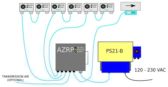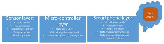 Thus, to get information about gas concentration, the possible solution is by using an individual gas detector for each miner. Such devices are used in the mine presently; however, they do not register data for deeper, more comprehensive analysis. For testing purposes, and installation of the measurement device with several gas-type detectors and long-term data acquisition, has been considered in copper mining in Poland but is more a research project than everyday practice. The device is a prototype. It can work up to 50 (IP65 certificate) []. The structure of the monitoring system is presented in Figure 1.