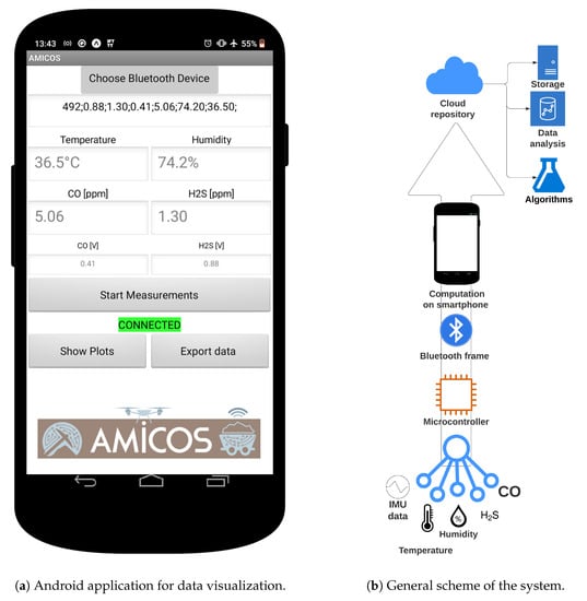 Our solution is low-cost, intuitive, easily accessible (everybody has a smartphone these days), and can also be used as a mobile data-acquisition device for long-term analysis on the surface using advanced analytical tools. It should be highlighted that using mobile phones for measurements is not a new idea; however, we have not met such an approach in underground mining. Mobile phones have been used in tele-medicine [], in condition monitoring [,], and environment monitoring [,]. See [,] for a review.