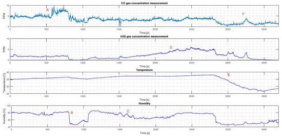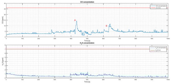 Experiments in the mine are always difficult and may have a lot of limitations so first we decided to test our device in lab conditions. The experiment aimed to check measurement ability and preliminarily evaluate the sensitivity of the system. As a source of CO gas, we have used an unburned piece of wood. We produced a bit of smoke. By decreasing the distance between the source of the smoke and the sensor, we have increased gas concentration that could be seen in Figure 8, point A and B. We cannot imitate the source of in the lab, so for the second gas, we just tested the ability of measurement concentration in the air. For both cases, one may notice some minor fluctuations in gas concentration. For both gases, we were far from the limit value used in the mine (note red lines, 26 ppm for CO and 7 for , are based on mining law []). An example of environmental data acquired during the test, namely CO and , is presented in Figure 8. The conclusion from that simple test is that system is working, data can be acquired and stored in the device and at least the CO sensor is able to react to change in CO concentration.