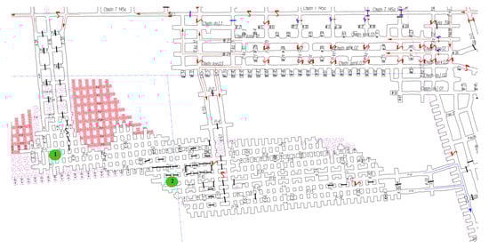 The examined mine is characterized by difficult operating conditions i.e., a large depth of exploitation, an extensive mine area, and harsh air atmosphere. The mine exploits minerals based on a room-and-pillar system. Excavations, where measurements were carried out, are marked in green circles on the map in Figure 9.