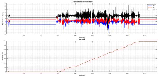 Using data from IMU sensors, built into the phone, distance calculation was performed with satisfactory accuracy. Signals are collected every 100 ms. When the main acceleration vector increases swiftly, then the application on the smartphone computes this event as a new step. Data is taken about acceleration and velocity in 3 axes. Based on that, when every considerable variation occurs, a step calculation function is triggered []. As can be seen in Figure 11 during the test, the length of distance is nearly 700 m. It could be helpful to estimate an overall distance made by the mine crew after the shift.