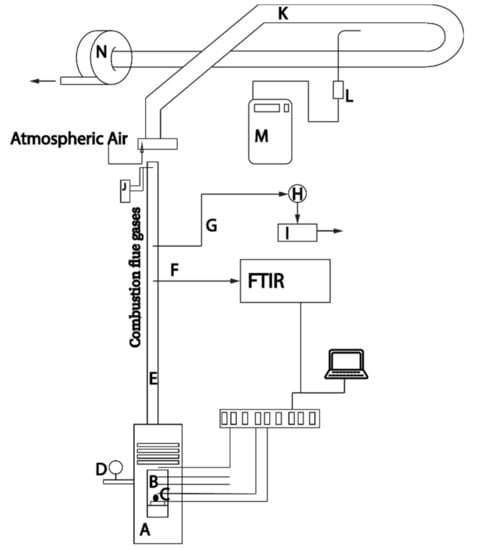 Installation scheme: modified from []. A—stove; B—combustion chamber; C—grate of the stove; D—air flow meter; E—exhaust duct (chimney); F—gas sampling and analysis system; G—water-cooled gas sampling probe; H—gas sampling pump; I—gas condensation unit; J—pitot tube; K—dilution tunnel; L and M—TECORA PM10 sampling system; and N—fan.