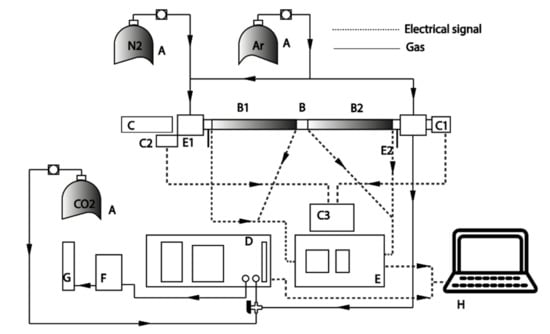 Scheme of the thermo-optical system used: modified from []. A—gas bottle; B—quartz oven; B1 and B2—heating zones; C—laser; C1—detector; C2—chopper; C3—amplifier; D—nondispersive infrared spectrophotometer; E—temperature controller; E1 and E2—thermocouplers; F—mass flow meter; G—rotameter; and H—computer.