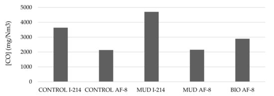 All pellets at some time exceeded the CO concentration of 1000 ppm in the flue gas during the test time. Experiments showed that the O2 concentration decreased with CO2 increase in the flue gases. The CO2 concentration in combustion gases is a complete combustion indicator, while the CO presence is an incomplete combustion indicator. There is a relationship between incomplete combustion and very low combustion temperatures. Experimental results also showed that the highest CO concentrations were obtained during I-214 MUD combustion (Figure 3). This can be explained by the fact that I-214 MUD had a high moisture content, which implied lower temperature values and, consequently, high CO concentration.