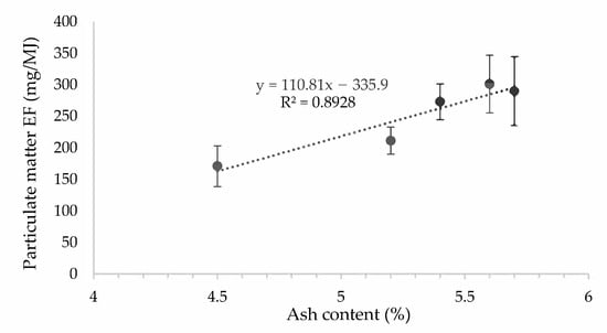 Particulate matter emission factors were calculated from the set of samplings carried out in all combustion cycles for the different types of pellets under the same operating conditions. Table 4 shows the particles emission factors, total carbon, elemental carbon, and organic carbon. The PM10 emission factors for all pellets were quite high compared to studies which work with other biomass sources [] or commercial pellets []. The ash content presented for the pellet sets evaluated in this work is even higher than that allowed by the European standard EN 14961-2 (Solid biofuels—Fuel specifications and classes—Part 2: Wood pellets for non-industrial use), which may explain the high emission factors for the particles. AF-8 MUD and I-214 CONTROL had the highest ash content (5.7 and 5.6% respectively) as well as the highest emission factors (301 and 290 mg/MJ). Figure 4 showed the relationship between the EF obtained for the different pellets and the respective ash content, showing that the ash content is a parameter that clearly influenced the particle emission factors.
