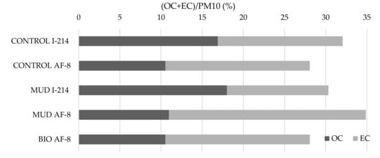 For the pellets of this work, it was observed that, in general, EC constituted the dominant portion of the carbon particles released (Figure 5). However, the data analysis showed that, during I-214 MUD combustion test, the emitted particulate material was dominated by OC. This result can be explained by the low temperatures in the combustion chamber observed for the I-214 MUD pellet test.