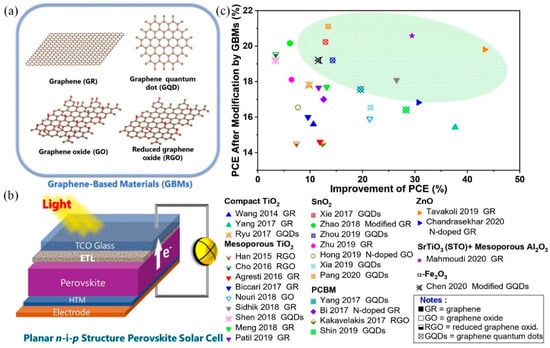 (a) Schematic of structures of graphene and its derivatives, (b) schematic cross section of planar n-i-p structure PSC, (c) comprehensive summary of power conversion efficiency (PCE) data for halide perovskite solar cells (PSCs) with electron transport layers (ETLs) comprised of graphene-based materials (GBMs) (power conversion efficiency (PCE) > 14%) [17,18,19,20,23,25,26,27,39,43,55,56,60,63,64,65,66,67,68,69,70,71,72,73,74] (TCO = transparent conducting oxide, HTM = hole transport material, green area = most efficient configurations for GBM-modified ETLs).