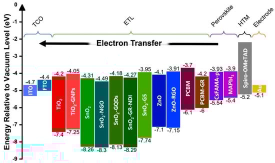 Figure 2 illustrates the energy levels of PSC component layers, including ETLs that have been modified using GBMs relative to the GBM-free analogues. As the ETL is required to extract and transport electrons as well as to block hole transport from the perovskite layer, materials suitable for ETLs should possess CBM or lowest unoccupied molecular orbital (LUMO) levels slightly lower than those of the perovskites; this situation enables electron transfer from the former to the latter. At the same time, ETLs should possess valence band maximum (VBM) or highest occupied molecular (HOMO) levels considerably lower than those of the perovskites; this situation prevents holes from entering the ETLs. The addition of GBMs can be used to tune the band energy levels of ETLs, viz., engineer the Eg, in order to achieve these ends in PSCs. For the entire cell, the direction of electron transport also requires the electrode (cathode) VBM to be above that of the HTM and that of the HTM to be above that of the perovskite as well as the CBM of the TCO (anode) to be below that of the ETL. Of course, this configuration also meets the requirement for the counter-transport of holes.