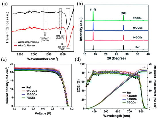 (a) FTIR spectra of TiO2-GQDs with and without O2 plasma treatment, (b) XRD patterns of perovskite on pristine TiO2 and TiO2-GQDs (14 nm, 10 nm, 7 nm), (c) current density-voltage (J-V) characteristics of PSCs, (d) external quantum efficiency (EQE) (or incident photon-to-current efficiency (IPCE)) spectra and integrated photocurrents of PSCs [18] (republished with permission from the Royal Society of Chemistry, conveyed through Copyright Clearance Center, Inc.).