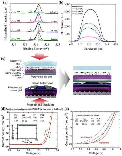 (a) O1s XPS spectra for TiO2 of different graphene nanoplatelets (GNP) additions, (b) photoluminescence (PL) spectra of TiO2 of different GNP additions [17] (republished with permission from American Chemical Society), (c) schematic of cross section of two-terminal perovskite/silicon heterojunction (JHT) tandem solar cell by mechanical stacking of layers and uniaxial pressing, (d) J-V characteristics and parameters measured for tandem solar cell (inset shows stabilized (PCE)), (e) J-V characteristics and parameters measured for bifacial PSC with and without graphene (GR) in the TiO2 bilayer ETL [79] (republished with permission from Elsevier).