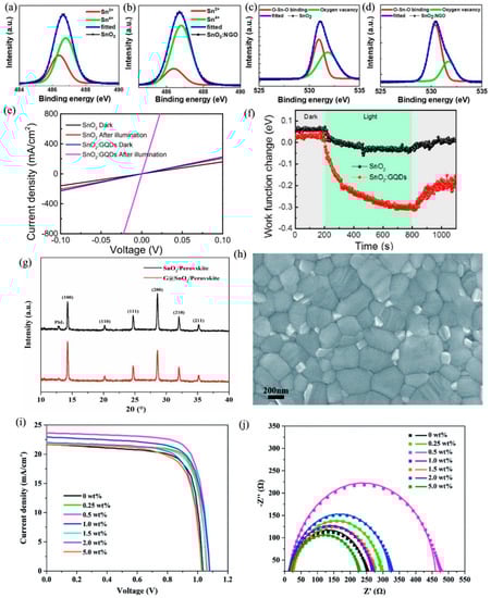 Sn 3d5/2 XPS spectra for (a) SnO2, (b) SnO2-NGO; O1s XPS spectra for (c) SnO2, (d) SnO2-NGO [26] (republished with permission from American Chemical Society); (e) J-V characteristics of the ETL-only devices (Ag/SnO2/ITO and Ag/SnO2-GQD/ITO under illuminated (simulated sunlight, the global standard spectrum (AM 1.5 G)) and dark conditions; (f) work function changes of ETL-only devices under illuminated and dark conditions [56] (republished with permission from American Chemical Society); (g) XRD patterns of perovskite films on SnO2 and SnO2-GQD; (h) top-view SEM image of perovskite with excess of PbI2; (i) J-V curves and (j) Nyquist plots (in the dark at a bias of –1.0 V) of PSCs based on SnO2 with different GQDs (5 nm Ø) concentrations [24] (republished with permission from Royal Society of Chemistry, conveyed through Copyright Clearance Center, Inc.).
