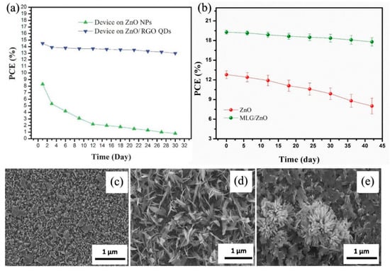 (a) Stabilities of PSCs with ETLs of ZnO nanoparticles (NPs) and ZnO/RGO QDs in ambient conditions after encapsulation over 30 days [81] (republished with permission from WILEY); (b) Stabilities of PSCs with ETLs of ZnO and ZnO with monolayer-GR (MLG/ZnO) in ambient conditions with 30% humidity over 42 days [43] (republished with permission from the Royal Society of Chemistry); top-view SEM images of ZnO nanorods modified by nitrogen-doped GR at concentration of (c) 0.4 wt %, (d) 0.8 wt %, (e) 1.0 wt % [74] (republished with permission from Elsevier)