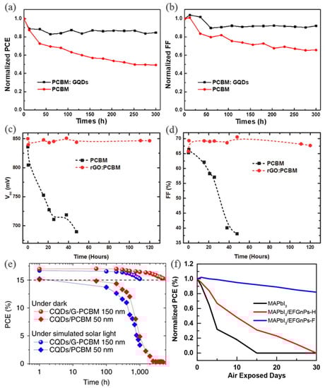 Yang et al. [70] reported data for PCBM and GQD-modified PCBM (PCBM-GQD), which were ETLs in p-i-n structure PSCs. The use of 0.5 wt % GQD increased the PCE from 14.68% to 17.56%. The electrical conductivity increased from 0.151 mS cm−1 to 0.422 mS cm−1. PCBM-GQD also showed enhanced electron extraction, which resulted in higher Voc and FF values. The unsealed PSC also exhibited stability owing to the maintenance of the PCE at ~80% and the FF at ~0.9after 300 h of continuous simulated solar illumination in the air at ~45% relative humidity. In contrast, the reference PSC with PCBM ETL showed a >50% decrease in PCE and a ~30% decrease in FF under the same conditions, as shown in Figure 7a,b. It was suggested that enhanced stability may result from the suppression of the dimerization of PCBM under light exposure through the addition of GQDs.