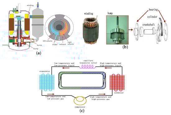 Structural diagram of inverter compressor and operation cycle: (a) inverter compressor structure; (b) stator winding and bump; (c) refrigeration loop of air-conditioner.
