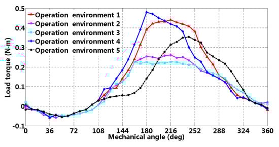 The structural diagram of inverter compressor (single rotor) is presented in Figure 1a, which is mainly composed of motor (PMSM), cylinder (pressure boosting), housing (supporting and sealing) and reservoir (filtering), etc. The refrigeration loop of air-conditioner is presented in Figure 1c; firstly, low-temperature and low-pressure gaseous refrigerant becomes high-temperature and high-pressure gaseous refrigerant by continuous compression; secondly, high-temperature and high-pressure gaseous refrigerant is condensed to high-temperature and high-pressure liquid refrigerant by water or air in the exterior; thirdly, high-temperature and high-pressure liquid refrigerant becomes low-temperature and low-pressure liquid refrigerant through capillary (expansion valve) regulating; moreover, the refrigerant amount is dominated by thermal load and refrigeration velocity, etc.; fourthly, low-temperature and low-pressure liquid refrigerant is evaporated to low-temperature and low-pressure gaseous refrigerant and the interior temperature drops. Because the cylinder is divided into left and right volume by eccentric piston and slider, left and right volume driven by motor conduct refrigeration suction, compression and exhaust alternatively, which results in load torque presenting approximately periodic characteristics [2]. In addition, different operating conditions (pressure gap and temperature gap, etc.) can result in load torque difference. Figure 2 [2] illustrates load torque under different operating conditions, and it can be observed that load disturbance presents approximately sinusoidal with respect to a rotor mechanical angle; meanwhile, magnitude and phase have significant differences.
