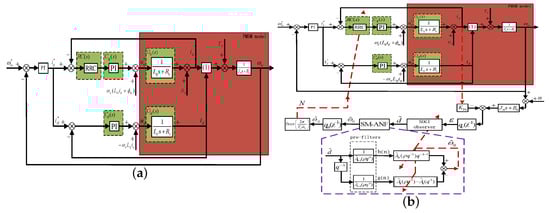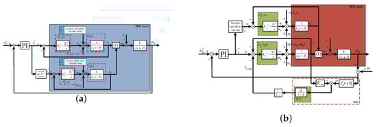 The equivalent control block diagram of inverter compressor driving system is presented in Figure 3a, where electrical angular speed between stator flux and rotor permanent magnetic flux is regulated for torque optimized efficiency, and represent axis VSI nonlinear voltage drop, respectively, and represent PI controller and load admittance, respectively, and represent axis proportional and integral coefficient, respectively, which can be determined by an I type system parameter tuning method. Although the PI controller can track a reference with a negligible steady state error and be robust against DC or low frequency disturbance, periodic disturbance can not be effectively suppressed because the sensitivity gain at disturbance related frequencies is small. The control block diagram of inverter compressor with general DOB is presented in Figure 3b. DOB, being a two degree of freedom controller based on an observer structure, can achieve high pass sensitivity and low pass complementary sensitivity because sensitivity corresponds to disturbance suppression performance and complementary sensitivity corresponds to noise sensitivity and robust stability [33,34]. For constant or slow varying disturbance, the trade-off between sensitivity and complementary sensitivity can be achieved through an appropriate cut-off frequency; disturbance can be effectively compensated and corresponding speed fluctuation can be asymptotically rejected; however, owing to the small sensitivity gain at fundamental and harmonic frequencies, periodic disturbance can not be effectively compensated by general DOB and corresponding speed fluctuation suppression performance is unsatisfactory.