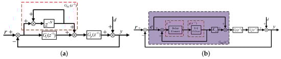 The structural diagram of ideal repetitive controller (IRC) is presented in Figure 4a, where represents an existing controller ( or controller) based on loop shaping method to achieve some characteristics (servo or robust characteristic), represents control plant, represents low pass filter with cut-off frequency ( represents sampling period), d represents external disturbance, in the red dashed line represents internal model of period disturbance. It can be observed that sensitivity function is equal to zero at fundamental and harmonic frequencies illustrating that output y can track reference r with negligible error in the steady state, where represents the sensitivity function of original system without RC; in other words, periodic disturbance can be effectively rejected: