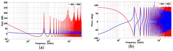 Gain and phase waveforms of IRC and RRC, where corresponding parameters are , rad/s, , and ms. (a) gain; (b) phase.