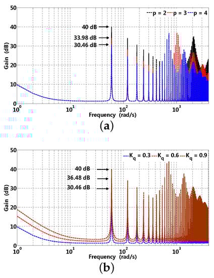 Gain and phase waveforms of RRC are also influenced by parameter p and . In Figure 9a, the gain at 60 rad/s are 40, 33.98 and 30.46 dB when is selected as 0.3, it can be observed that the gain becomes larger with p increasing; in addition, computational complexity has an insignificant increase compared to that of smaller. A similar situation can exist in Figure 9b, the gains at 60 rad/s are 30.46, 36.48, and 40 dB when p is selected as 3; it can be observed that the gain at related frequencies becomes larger with increasing. On one hand, larger can result in better disturbance suppression characteristic in the steady state; on the other hand, the stability margin is comparably sufficient with smaller . Gain and phase waveforms of -axis current sensitivity and complementary sensitivity are presented in Figure 10 and Figure 11, respectively, where sensitivity (disturbance suppression characteristic) and complementary sensitivity (robustness) should make a trade-off between each other [36]. Generally, high real harmonics possess little energy compared to that of lower harmonics, which illustrates that the band stop characteristic of RRC is gradually attenuated in the high frequency range. It can be observed that the gain approaches that of the original PI controller presented in Figure 10a; in addition, Figure 10b illustrates that the phase of RRC chatter at disturbance frequency and its multiple, stability can be guaranteed by almost the same phase margin compared to that of the original PI controller. Furthermore, high frequency noise can be rejected to some extent by RRC presented in Figure 11a, while the original PI controller can not.