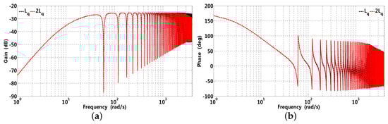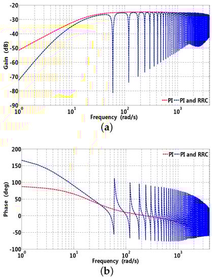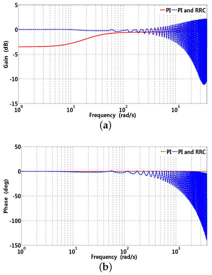 The order of S–G filter is determined by cut-off frequency, sensitivity gain, and current sampling noise, etc. On one hand, if current sampling is noisy, a larger p can improve NRR; on the other hand, larger NRR can result in cut-off frequency drop, and dynamic response of current-loop may be influenced. is introduced to guarantee sensitivity gain and phase margin of the current-loop; in addition, error is directly feedforward presented in the light purple area of Figure 4b, which is convenient to RRC’s activation or suspension; furthermore, RRC can be suspended when is selected as zero; that is to say, RRC recovers its original (PI controller). Gain and phase waveforms of IRC and RRC are presented in Figure 6, where the targeted frequencies are 60 rad/s and its multiple, it can be observed that RRC’s gain is smaller compared to that of IRC; moreover, the phase of RRC gradually approaches zero. However, the phase of IRC still chatters between and . Consequently, RRC can be employed to suppress speed fluctuation brought about by load disturbance in a low frequency range.