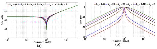 The block diagram of SOGI is presented in Figure 14a, which can track or reject a certain frequency sinusoidal signal with insignificant error according to an internal model theorem. The block diagram of SOGI observer is presented in Figure 14b, which mainly consists of pre and post SOGI. Pre SOGI, being a band stop filter (BSF), is mainly employed to suppress -th current harmonic brought about by the VSI nonlinear voltage drop. The gain waveforms of pre SOGI with respect to parameter are presented in Figure 15a; it can also be observed that the bandwidth of BSF becomes narrower with decreasing; however, smaller can slow down the response ratio; therefore, suppression performance and response ratio should be taken into consideration comprehensively when selecting . Post SOGI is essentially a BPF, by selecting fundamental wave frequency as resonant frequency, which can filter off harmonic components effectively; in addition, constant quality factor () is convenient to extract a fundamental wave component from periodic disturbance, while the quality factor of general BPF is generally variable and determined by central frequency, bandwidth parameter, etc. The gain waveforms of post SOGI are presented in Figure 15b, and it is clear that decreases results in a remarkable narrowing of the pass band. When harmonic components are considerably abundant, a smaller can be preferred; however, a smaller can slow down the response ratio; therefore, it should achieve an optimal band pass characteristic between bandwidth and response ratio.
