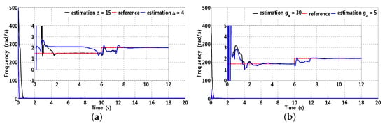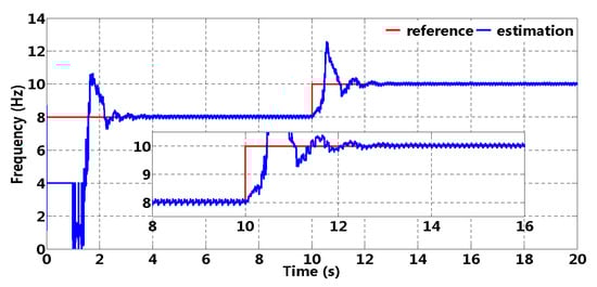 with cut-off frequency is adopted to smooth frequency estimation and avoid possible overshoot. As presented in Figure 16b, it can be observed that, for , frequency estimation has great overshoot in the beginning, and it takes 2 s to track the reference frequency; however, for , frequency estimation waveform becomes smooth without great overshoot in the beginning and frequency sudden change. Consequently, an appropriate selection of cut-off frequency can smooth frequency estimation and avoid possible overshoot.