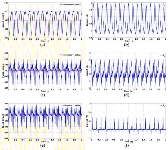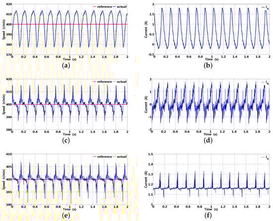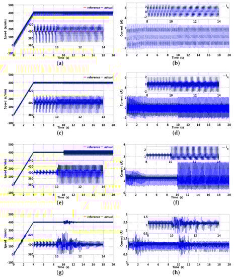 The speed and corresponding -axis current based on an original PI controller (without -axis current compensation), general DOB, RRC, and ARRC are presented in Figure 17, where the left and right show speed and corresponding -axis current, respectively. Speed and corresponding -axis current with the original PI controller are presented in Figure 17a,b, and it can be observed that speed has obvious fluctuation; in addition, -axis current has periodic fluctuation which is primarily brought about by periodic load disturbance. Speed and corresponding -axis current with DOB are presented in Figure 17c,d, and all disturbance components (including periodic and aperiodic) within the cut-off frequency can be employed for -axis current compensation, although speed fluctuation can be suppressed to some extent (no more than 20 r/min), and a small sensitivity gain at disturbance related frequencies can not further enhance speed fluctuation suppression performance. Speed and corresponding -axis current with RRC are presented in Figure 17e,f, and it can be observed that speed fluctuation can be effectively suppressed before fundamental frequency variation; however, RRC lacks frequency adaptiveness results in apparent speed fluctuation after fundamental frequency variation. The speed and corresponding -axis current with ARRC are presented in Figure 17g,h, and apparent speed fluctuation in a transient stage (speed up), owing to frequency estimation deviation, takes almost 4 s to recover its steady state; in addition, it has small speed fluctuation (no more than 10 r/min), and a similar situation can exist when fundamental frequency changes suddenly. From the analyses mentioned above, speed fluctuation can be effectively suppressed with ARRC owing to sufficient sensitivity gain at fundamental and harmonic frequencies compared to that of DOB; meanwhile, an RRC lack of frequency adaptiveness may cause speed fluctuation suppression performance to deteriorate after fundamental frequency variation. Therefore, speed fluctuation brought about by periodic disturbance can be effectively suppressed by ARRC, while RRC can not.