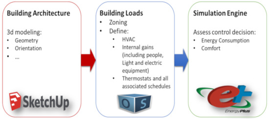 Then the various zones are defined with their loads and their controls with the OpenStudio software. Finally, the model is exported to an “.idf” file, which is the file format used by the EnergyPlus software as a building model under study.