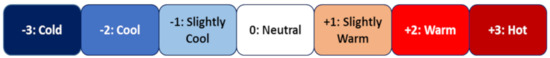 Comfort is defined here by means of the predicted mean vote (PMV). PMV is an index, developed by Fanger, that aims to predict the mean value of votes of a group of occupants on a seven-point thermal sensation scale, as shown in Figure 5.